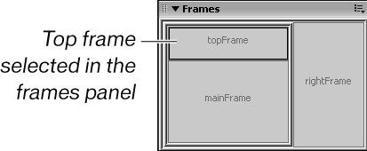 Tip If the Frames panel is not open, choose Window > Frames. Selecting the top-left frame in the Frames panel is not the same as placing the insertion point inside the top-left frame by clicking in the Document window. Selecting the frame makes the properties for that frame available to you in the Property inspector. Clicking in the frame in the Document window makes the standard text properties appear for that frame's document. If the insertion point is in the top-left frame, it is the active frame; however, you can't make changes to the frame properties. To affect the properties of the frame itself, it needs to be selected.