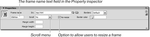 Note When naming frames, don't use spaces, hyphens, periods, or special characters in the frame name; and don't begin the name with an underscore. Using any of these characters can cause problems with code or scripting. Also, most coding languages are case sensitive, so make sure you maintain consistency with your frame names. | | | 3. | Verify that No is selected in the Scroll menu and that the No Resize box is checked in the Property inspector.