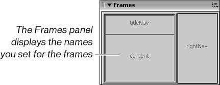 The Frames panel displays the word titleNav in the top frame. You can always refer to the Frames panel for the name of a particular frame. Frame names are often used to target links to load in specific frames. You learned about targeting links in Lesson 3.