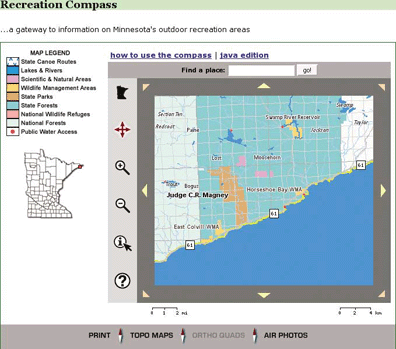 Figures 1-3, 1-4, and 1-5 show the web pages of three such sites. They show how diverse some MapServer applications can be, from street-level mapping to statewide overviews. Figure 1-3. The MapServer-based restaurant mapping application from MapItOut![]() Figure 1-4. A MapServer-based tourism application for Hawaii from MapSherpa![]() Figure 1-5. A web map for finding recreation sites in Minnesota, U.S.A.![]() Of course, not all maps out there are built with MapServer; Table 1-2 lists other mapping sites that you may want to look to for inspiration.