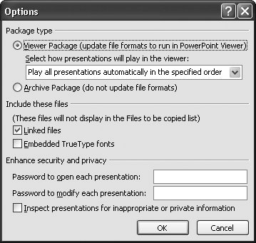 Tell PowerPoint how you want your audience to run your packaged presentation. To do so, click Options; then, in the Options dialog box you see in Figure 7-18, set one or more of the following: -