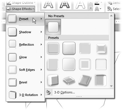 9.2.5. Applying Special EffectsNew in PowerPoint 2007 is the ability to add special effects like glows, reflections, shadows, and beveling to your shapes and lines with just a couple of mouse clicks. Technically, you can apply any special effect you like to lines as well as to shapes. But because lines tend to be skinny, they usually don't benefit much from 3-D effects. Select the shape or line you want to apply a special effect to. Then, click Drawing Tools Format
