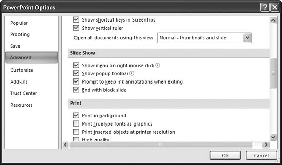 13.3. Customizing the Way Your Slideshows RunWhile most of PowerPoint's customization options focus on the PowerPoint development environment, several affect the way your slideshows run. This section shows you how to control the way you interact with your slideshows while you're running them.