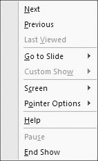 13.3.2. Show (or Hide) the Right-Click MenuNormally, when you run a slideshow, right-clicking anywhere on a slide pops up the menu shown in Figure 13-27. The right-click menu can be a boon to inexperienced presenters, because it lets them choose options without having to remember keyboard shortcuts. But flashing a menu can seriously break the rhythm of the presentation, especially if you do it too often. And if there's a chance it's going to tempt a presenter to chew up a lot of the audience's time searching for the perfect electronic pen nib and color , or if there's a chance inappropriately titled slides may appear in the "Go to Slide" list, it's best to hide the menu altogether.