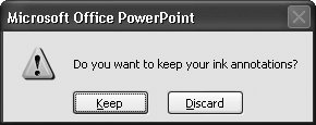 13.3.3. Give Yourself the Option to Keep Ink AnnotationsPowerPoint lets you "draw" on your slides electronically (Figure 13-28). Unless you tell it otherwise , the program assumes you don't want to keep your scribbles, but instead want to discard them when you end the slideshow so that the next time you present the slideshow, you start fresh with clean, unmarked slides.