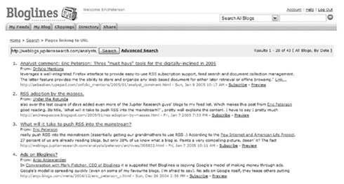 An emerging frontier in web measurement is the ability to track weblog readership, referrals, and link out clicks. No known vendors support weblog measurement directly, but this surprisingly simple hack will show you how to do it yourself! Given the attention paid to weblogs and the blogosphere in general, it is surprising that no vendors have stepped up to provide a solution to measure content syndicated via really simple syndication (RSS). I personally have been blogging in the dark via my employer's web site for over a year, always wondering "Who reads this stuff and what do they say about it?" It turns out there are a few things you can do to measure reach and acquisition for your syndicated content, depending on how involved you want to get, your particular web measurement application, and the RSS publication platform you publish from. 3.12.1. Easy Things You Can Do to Measure RSS ReadershipIf you're only trying to figure out who is linking to your posts, not necessarily how many people are reading or which links they're clicking, Bloglines (www.bloglines.com) provides an excellent tool for doing exactly that. Their search for pages linking into a URL accepts the location of your weblog (for example, http://weblogs.jupiterresearch.com/analysts/peterson/) and tells you who is linking to you (Figure 3-12). Figure 3-12. Bloglines citation search Bloglines returns a list of other feeds indexed by their service that have a link to your site. Considering that at the time this book was written, Bloglines enjoyed a greater than 50 percent market share for RSS readers (an estimated four million people, based on data from the Pew Internet and American Life Project), the sample Bloglines provides is pretty good. Other resources for tracking how your posts are picked up around the Internet include: