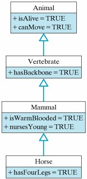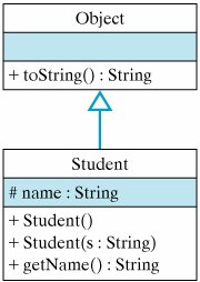 8.2. Java's Inheritance MechanismAs we described in Chapter 0, class inheritance is the mechanism whereby a class acquires (inherits) the methods and variables of its superclasses. To remind you of the basic concept, let's repeat an earlier example: Just as horses inherit the attributes and behaviors associated with mammals and vertebrates, a Java subclass inherits the attributes and behaviors of its superclasses. Figure 8.1 uses a UML diagram to illustrate the relationships among horses, mammals, vertebrates, and animals. As the root of the hierarchy, which is always shown at the top, the Animal class contains the most general attributes, such as being alive and being able to move. All animals share these attributes. The class of vertebrates is a somewhat more specialized type of animal, in that vertebrates have backbones. Similarly, the class of mammals is a further specialization over the vertebrates in that mammals are warm-blooded and nurse their young. Finally, the class of horses is a further specialization over the class of mammals, in that all horses have four legs. Some mammals, such as humans, do not have four legs. Thus, by virtue of its class's position in this hierarchy, we can infer that a horse is a living, moving, four-legged vertebrate, which is warm blooded and nurses its young. Figure 8.1. A class hierarchy for horses. We have deliberately used an example from the natural world to show that the concept of inheritance in Java is inspired by its counterpart in the natural world. But how exactly does the concept of inheritance apply to Java (and to other object-oriented languages)? And, more important, how do we use the inheritance mechanism in object-oriented design? 8.2.1. Using an Inherited MethodIn Java, the public and protected instance methods and instance variables of a superclass are inherited by all of its subclasses. This means that objects belonging to the subclasses can use the inherited variables and methods as their own. We have already seen some examples of this in earlier chapters. For example, recall that by default all Java classes are subclasses of the Object class, which is the most general class in Java's class hierarchy. One public method that is defined in the Object class is the toString() method. Because every class in the Java hierarchy is a subclass of Object, every class inherits the toString() method. Therefore, toString() can be used with any Java object. To illustrate this, suppose we define a Student class as follows: public class Student { protected String name; public Student(String s) { name = s; } public String getName() { return name; } } Figure 8.2 shows the relationship between this class and the Object class. As a subclass of Object, the Student class inherits the toString() method. Therefore, for a given Student object, we can call its toString() as follows: Student stu = new Student("Stu"); System.out.println(stu.toString()); Figure 8.2. The Student class hierarchy. How does this work? That is, how does Java know where to find the toString() method, which, after all, is not defined in the Student class? The answer to this question is crucial to understanding how Java's inheritance mechanism works. Note in this example that the variable stu is declared to be of type Student and is assigned an instance of the Student class. When the expression stu.toString() is executed, Java will first look in the Student class for a definition of the toString() method. Not finding one there, it will then search up the Student class hierarchy (Fig. 8.2) until it finds a public or protected definition of the toString() method. In this case, it finds a toString() method in the Object class and executes that implementation of toString(). As you know from Chapter 3, this would result in the expression stu.toString() returning something like: Student@cde100 The default implementation of toString() returns the name of the object's class and the address (cde100) where the object is stored in memory. However, this type of result is much too general and not particularly useful. 8.2.2. Overriding an Inherited MethodIn Chapter 3 we pointed out that the toString() method is designed to be overriddenthat is, to be redefined in subclasses of Object. Overriding toString() in a subclass provides a customized string representation of the objects in that subclass. By redefining toString() in our OneRowNim class, we were able to customize its actions so that it returned useful information about the current state of a OneRowNim game. To override toString() for the Student class, let's add the following method definition to the Student class: public String toString() { return "My name is " + name + " and I am a Student."; } Given this change, the revised Student class hierarchy is shown in Figure 8.3. Note that both Object and Student contain implementations of toString(). Now, when the expression stu.toString() is invoked, the following, more informative, output is generated: My name is Stu and I am a Student. Figure 8.3. The revised Student class hierarchy. In this case, when Java encounters the method call stu.toString(), it invokes the toString() method that it finds in the Student class (Fig. 8.3). These examples illustrate two important object-oriented concepts: inheritance and method overriding. Effective Design: Inheritance