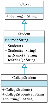 8.2.6. Inheritance and ConstructorsJava's inheritance mechanism applies to a class's public and protected instance variables and methods. It does not apply to a class's constructors. To illustrate some of the implications of this language feature, let's define a subclass of Student called CollegeStudent: public class CollegeStudent extends Student { public CollegeStudent() { } public CollegeStudent(String s) { super(s); } public String toString() { return "My name is " + name + " and I am a CollegeStudent."; } } Because CollegeStudent is a subclass of Student, it inherits the public and protected instance methods and variables from Student. So a CollegeStudent has an instance variable for name, and it has a public getName() method. Recall that a protected element, such as the name variable in the Student class, is accessible only within the class and its subclasses. Unlike public elements, it is not accessible to other classes. Note that CollegeStudent overrides the toString() method, giving it a more customized implementation. The hierarchical relationship between CollegeStudent and Student is shown in Figure 8.4. A CollegeStudent is a Student, and both are Objects. Figure 8.4. The class hierarchy for CollegeStudent. Note how we have implemented the CollegeStudent(String s) constructor. Because the superclass's constructors are not inherited, we have to implement this constructor in the subclass if we want to be able to assign a CollegeStudent's name during object construction. The method call, super(s), is used to invoke the superclass constructor and pass it s, the student's name. The superclass constructor will then assign s to the name variable. As we have noted, a subclass does not inherit constructors from its superclasses. However, if the subclass constructor does not explicitly invoke a superclass constructor, Java will automatically invoke the default superclass constructorin this case, super(). By "default superclass constructor" we mean the constructor that has no parameters. For a subclass that is several layers down in the hierarchy, this automatic invoking of the super() constructor will be repeated upward through the entire class hierarchy. Thus when a CollegeStudent is constructed, Java will automatically call Student() and Object(). If one of the superclasses does not contain a default constructor, this will result in a syntax error.