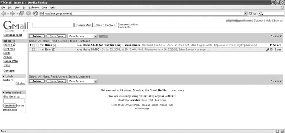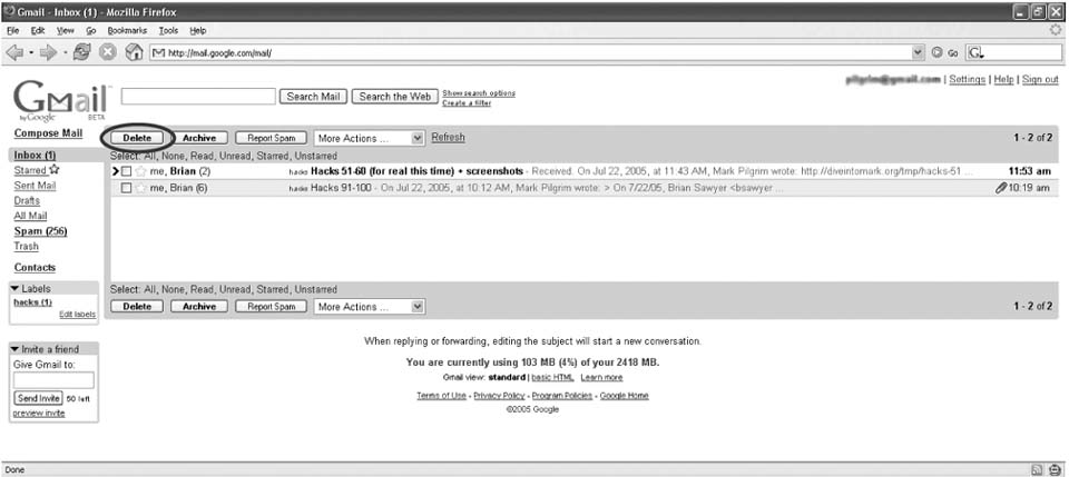 Improve the Gmail interface with the most requested feature that Google doesn't want you to have. Many netizens have gotten a Gmail account and been wowed with the interface, but noticed one critical missing piece: there is no easy way to delete a message. Deletion in the standard Gmail interface requires opening the drop-down actions box and selecting the last item, which is cumbersome for a frequent activity. This hack alters the user interface of Gmail to include an extra button that lets the user delete any message with one simple click. 7.6.1. The CodeThis script is split into five parts.
