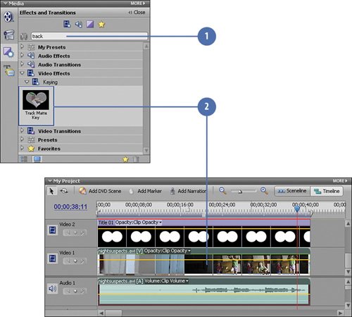 Drag and drop the Track Matte Key effect from the Keying category of Video Effects onto the nightsuspects.avi clip on the Video 1 track on the Timeline.