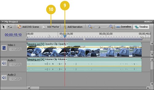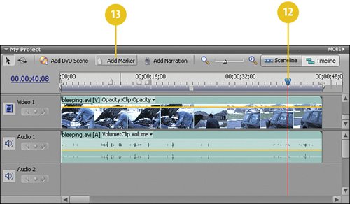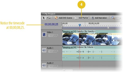 Finding and Marking "Offensive Moments" On this step, you'll first listen to the clip once through to find the sections of the video where "bad things happen." Next, you play it again with your finger poised over the Spacebar on your keyboard. As you reach each "bad place," you'll hit the Spacebar, place a marker, and hit the Spacebar again to move on. The marker will let you jump to each bad place to take remedial action in the next step. Go on the Offense We need the My Project panel to be in Timeline view, if it isn't already. To switch to Timeline view, click the Timeline button in the upper right of the My Project panel.