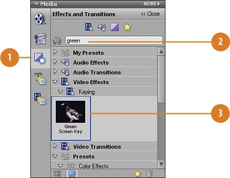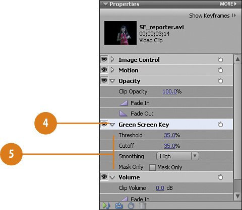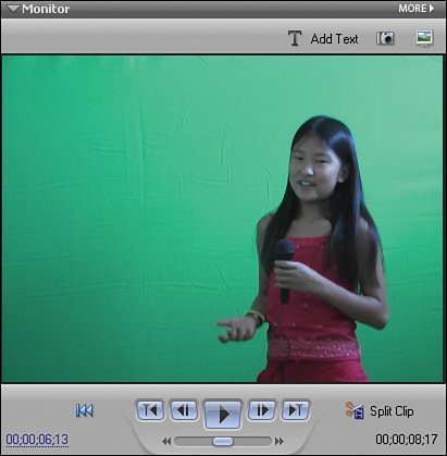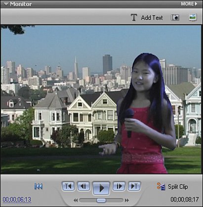 | Our intrepid reporter, after a grueling day at virtual airports and in the air, is to arrive in San Francisco for her next report, "live on location." Just as for the New England clip, we need to strip away the green background from the SF_reporter.avi clip. To do so, we again employ the Premiere Elements effect, the Green Screen Key. Find and Apply the Green Screen Key