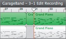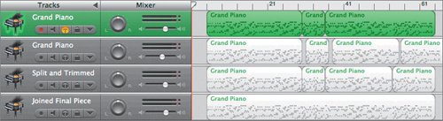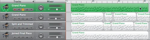 The second Grand Piano track in the Timeline shows the recording before all of the gaps were split and deleted. The Split and Trimmed track shows the final timing with all of the gaps removed and adjusted and the excess trimmed off. You'll notice that there is an extra split section at the end, which was created to remove a slight gap between the last two parts of the song. Feel free to experiment in removing the last gap after this lesson. Joining Regions in the TimelineOnce you've split and positioned all of the regions in a track, you can join the parts together to create one long region. Although joining isn't necessary, it can come in handy sometimes if you want to move the entire finished piano parts around in the track, or copy and paste them, or even modify their timing or velocity. You can join any recorded regions together, or regions from loops that came from the same original loop. The Joined Final Piece track shows all of the separated regions joined into one finished region. To join regions, you first select them, then press Cmd-J or choose Edit > Join. Let's try it.