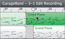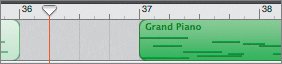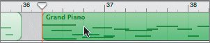 Nice work! Sounds very natural, yet still includes a slight pause between sections of the song. Trimming a RegionThere are two ways to extend or shorten a Software Instrument region. You can extend it as a new looped segment by dragging the upper-right corner to the right in the Timeline, or you can trim it by dragging the lower-right corner toward the left. You can only extend or trim a region from the right side. This is to maintain the original integrity of the piece. If you want to remove part of the beginning of a region, you can always split it and delete the segment before the split. In this exercise, you'll trim the excess notes from the end of the last region. These were backup sections I recorded at the end of the song in case I wanted to use them instead of the first take.
