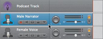 | Now that you are comfortable with showing and hiding the various panes you'll be using during this lesson, let's move on to setting up your podcast recording equipment. Note A project can include either a Podcast Track or a Video Track, but not both. If you try to show the Video Track for a project that contains a Podcast Track, a dialog appears asking if you want to replace the Podcast Track with a Video Track and vice versa. Choosing Podcast Recording Equipment Recording audio for a podcast in GarageBand 3 can be as easy or complicated as needed for your particular project. For example, if your podcast needs only one voice track, you can record the narration to an enabled Real Instrument track by connecting a microphone to your computer or by using the built-in microphone (if it has one). An iSight camera will also work because it includes a fully functioning microphone that is perfect for recording podcast audio as well as visuals. In fact, you can even record remote interviews with iChat users. Remember that the voice tracks you record for a podcast are Real Instrument tracks, so they follow the same recording rules you learned in Lesson 6. You can record a maximum of eight Real Instrument tracks and one Software Instrument track simultaneously. To record more than one track at a time, you'll need to use an external audio interface. Due to the popularity of GarageBand, a variety of third-party recording equipment is available. When I'm creating projects for these books, I try to find equipment that is both GarageBand-friendly and modestly priced. The podcast you'll be working on later in this lesson includes four Real Instrument voice tracks, plus a Software Instrument track used for sound effects. To record all four voice tracks at the same time, I used the Edirol FA-101, which is the same audio interface I used for recording Real Instruments in Lesson 6.  To record my narration, I used the new Blue Snowball USB microphone, which plugs into any USB port. It doesn't require any additional software or drivers, and it works well for these types of projects.  To trigger sampled MIDI sound effects during the podcast recording, I use the small Edirol PCR-A30 MIDI keyboard/audio interface. This is the same keyboard I used to record Software Instrument parts in Lesson 3.  Finally, I use the M-Audio iControl for GarageBand, which I have to confess I've been using throughout the process of writing this book.  The iControl is a GarageBand-specific USB device that allows you to select, mute, solo, record enable, pan, and adjust volume on tracks, as well as operate the transport controls, add effects, and adjust the master volume. For me, using the external iControl device to control the tracks and transport controls, and an external MIDI keyboard to trigger sounds, enables me to focus on the live podcast interviews without using the mouse or computer keyboard.   In addition to my various MIDI keyboards, I also keep an iGuitar handy for recording riffs, guitar parts, and song ideas. The iGuitar.USB by Brian Moore Guitars is an exciting development in the world of digital music recording. It is the first guitar to offer on-board, class-compliant USB audio to streamline the guitar-to-computer connection, eliminating the need for an external audio interface. In other words, you can use a standard USB cable to hook the iGuitar to the computer and record real guitar parts into GarageBand without any other equipment. More Info You can find more information on GarageBand accessories at www.apple.com/ilife/garageband/accessories.html. You can find out more about the iGuitar at www.brianmooreguitars.com. Again, let me stress that none of this equipment is necessary to create a podcast, and you can often get along with minimal equipment. I just wanted you to see some of the other options, especially if you plan to create a lot of enhanced podcast episodes or music projects. Before recording, make sure that your equipment is turned on and properly connected to the computer. For more specifics on the operation of your equipment, refer to the equipment manuals. Exploring the Vocal Track Presets GarageBand includes microphone settings and vocal enhancement effects that can be applied to a vocal track before or after recording. These effectsavailable in the Details area of the Track Info paneare designed to improve the quality of your vocal recordings. | | 1. | In the Timeline, double-click the Male Voice track header.