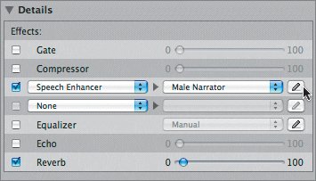 | | | 4. | To open the Speech Enhancer controls, click the Edit button (looks like a pencil) for the Male Narrator preset.