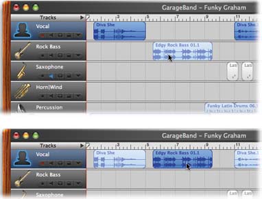 | Playing more tracks makes GarageBand work harder. In many cases, though, you can combine the material from several tracks into a single one. It's especially easy to combine blue Real Instrument tracks. Figure 10-3 shows the procedure. Combining green Software Instrument tracks is more difficult, because dragging a region into a different track usually means that its instrument sound changes. Not to worry: You can always turn Software Instrument regions into Real Instrument regions , as described on Section 2.3.2, and then merge them.