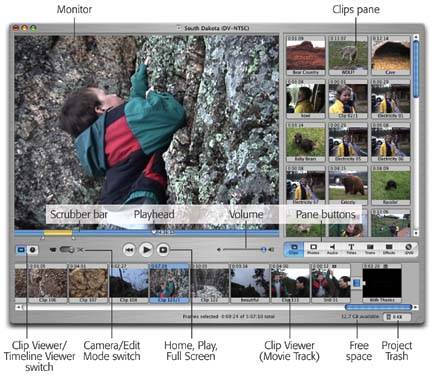 Clip Viewer/Timeline Viewer . You'll spend most of your editing time down here. Each of these tools offers a master map that shows which scenes will play in which order, but there's a crucial difference in the way they do it. When you click the Clip Viewer button ( marked by a piece of filmstrip), you see your movie represented as slides . Each clip appears to be the same size , even if some are long and some are short. The Clip Viewer offers no clue as to what's going on with the audio, but it's a supremely efficient overview of your clips' sequence. When you click the Timeline Viewer button (marked by the clock), on the other hand, you can see the relative lengths of your clips, because each shows up as a colored band of the appropriate length. Parallel bands (complete with visual "sound waves," if you like), underneath indicate blocks of sound that play simultaneously. -