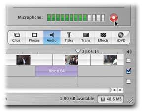 Click Stop to complete the recording . Now a new stripe appears in the upper soundtrack, already highlighted, bearing the name Voice 01, like the one shown in Figure 17-1. Drag the Playhead to the leftto the beginning of the new recordingand then press the Space bar to listen to your voice-over work. If the narration wasn't everything you hoped for, it's easy enough to record another "take." Just click the stripe representing your new recording and then press Delete to get rid of it. Then repeat the process. | Figure 17-3. To summon the narration controls, click the Audio button. If your microphone is correctly hooked up, the round, red Record Voice button is available. (Otherwise, it's dimmed.) Just beside the Record button is a live "VU" level meter. Test your setup by speaking into the microphone; if this meter twitches in response, you're ready to record. | | |