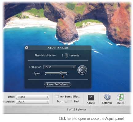 9.4.2.2. Transition speed and directionYou can also control the speed of the transitions on a slide-by-slide basis, and even which direction the transition effect proceeds across the screen (for transition styles that offer a choice). Because Apple figures this isn't the sort of control most people need every day, it hid these controls away. To see them, click the black Adjust button shown in Figure 9-6. Dragging the Speed slider left or right gets through the transition slower or faster. Tip: The idea behind the design of the strangely see-through Adjust panel is that you can leave it open . You can park it anywhere onscreen as you work through the slides in your show. Simply put, as you click a new slide, the Adjust panel changes to reflect whatever settings are in place for that photo. In other words, don't waste your time closing and reopening it. 9.4.2.3. Slide timingAs you know, the Settings dialog box (Figure 9-5) is where you specify how long you want each slide to remain onscreenin general. But if you want to override that setting for a few particularly noteworthy shots, the Adjust panel (Figure 9-6) is once again the solution. With the specially blessed photo on the screen before you, summon the Adjust panel (click the Adjust button, if the panel isn't already open). Use the "Play this slide for __ seconds" control to specify this slide's few seconds of fame. Tip: If you click the Reset to Defaults button in the Adjust panel, iPhoto wipes out any individual-slide customizations. It then reapplies your global transition and slide-timing settings to the selected photo. 9.4.2.4. Cropping and zoomingHere's another brand new (and totally undocumented) feature in iPhoto 5: You can choose to present only part of a photo in a slideshow, in effect cropping out portions of it, without actually touching the original. To enlarge the photo (thus cropping out its outer margins), just drag the Size slider at the lower-right corner of the iPhoto window. Whatever photo size you create here is how it will appear during the slideshow. What you may not realize, though, is that you can also drag inside the picture itself to shift the photo's position onscreen. Between these two techniquessizing and slidingyou can set up a very specific portion of the photo. (Heck, you could even present the photo twice in the same slideshow, revealing half of it the first time, half of it the next.) 9.4.2.5. The Ken Burns Effect checkboxIf you flip back a few pages, you'll be reminded that the Ken Burns effect is a graceful , panning, zooming effect that brings animation to the photos of your slideshow, so that they float and move instead of just lying there. You'll also be reminded that when you apply the effect to an entire slideshow, you have no control over the pans and zooms. iPhoto might begin or end the pan too soon, so that the primary subject gets chopped off. Or maybe it zooms too fast, so that your viewers never get the chance to soak in the sceneor maybe it pans or zooms in the wrong direction for your creative intentions. Fortunately, the Ken Burns Effect controls located here let you control every aspect of the panning and zooming for one photo at a time. (Note: The settings you're about to make override whatever global Ken Burns setting you've made.) As you can see in Figure 9-7, it works like this: