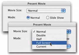 14.2. QuickTime Player ProIf you've spent the $30 to upgrade to the Pro version of QuickTime Player, you've unlocked a number of additional features. Some of these are playback tricks described in the previous section; others are especially useful for iMovie work. Read on. 14.2.1. Presenting Your Movies After going to the trouble of editing down your footage (as described in Part 2) and exporting it as a QuickTime movie (as described in Chapter 12), what you may want to do most of all is to show the movie to other people. Even the non-Pro version of QuickTime Player can play movies, of course, but the Pro version offers a much better showcase for your work: the Movie "Presenting" your movie is the best possible way to view a QuickTime movie on your screen. When you use this command (Figure 14-3), QuickTime Player blacks out the screen, automatically magnifies your monitor image (by choosing a lower resolution) so that the movie fills more of the screen, and devotes all the Mac's power to playing the movie smoothly. (To interrupt the movie, press