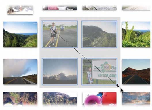To select several photos by dragging . You can drag diagonally to highlight a group of nearby photos, as shown in Figure 5-5. You don't even have to enclose the thumbnails completely; your cursor can touch any part of any icon to highlight it. In fact, if you keep dragging past the edge of the window, iPhoto scrolls the window automatically. Tip: If you include a particular thumbnail in your dragged group by mistake, -click it to remove it from the selected cluster. -