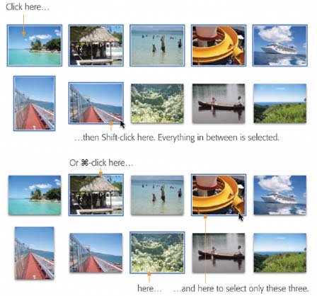To select consecutive photos . Click the first thumbnail you want to highlight, and then Shift-click the last one. All the files in between are automatically selected, along with the two photos you clicked (Figure 5-6, top). This trick mirrors the way Shift-clicking works in a word processor, the Finder, and many other kinds of programs. Figure 5-6. Top: To select a block of photos (as indicated by the faint colored border on each one), click the first one, and then Shift-click the last one. iPhoto selects all the files in between your clicks. Bottom: To select nonadjacent photos, -click them. (Or, to remove one of the photos from your selection, -click it.) -