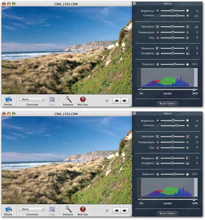 6.14. Brightness and Contrast SlidersOnce you've massaged the Exposure and Levels controls, the overall exposure for a picture usually looks pretty good. In effect, you've managed to create a full range of tones from dark to light. So why, then, does Apple include Brightness and Contrast sliders, which govern similar aspects of your photo's appearance? Reason #1: They've always been part of iPhoto, and millions of people are used to them. Reason #2: They're not quite the same as Exposure and Levels. 6.14.1. BrightnessWhen you move the Brightness slider, you're making the entire image lighter or darker . You're literally sliding the entire histogram to the left or right without changing its shape (Figure 6-12). (Remember that the Exposure and Levels controls affect the midtones, highlights, and shadows independently.) Figure 6-12. Top: Moving the Contrast slider to the right added more punch. Instead of moving the Levels endpoints inward, the mountains moved outward toward the endpoints. Remember, the farther outward you stretch the graph, the more difference you create between the darkest and lightest tones. |