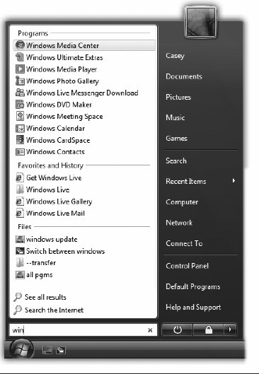 2.4. What's in the Start MenuThe following pages take you on a whirlwind tour of the Start menu itselffrom the bottom up, left to right, the way your mouse encounters its contents as it moves up from the Start button. 2.4.1. Search BoxThis thing is awesome . The instant you pop open the Start menu, your insertion point blinks in the new Start Search box at the bottom of the menu (Figure 2-4). That's your cue that you can begin typing the name of whatever you want to open .