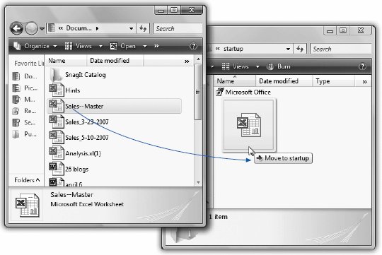 Another set of folders is designed to trim down the Programs menu by consolidating related programs, like Games, Accessories (little single-purpose programs), and Extras and Upgrades. Everything in these folders is described in Chapter 6. 2.4.3.1. The Startup folderThis folder contains programs that load automatically every time you start Windows Vista. This can be a very useful feature. For instance, if you check your email every morning, you may as well save yourself a few mouse clicks by putting your email program into the Startup folder. If you spend all day long word processing, you may as well put Microsoft Word in there. Of course, you may be interested in the Startup folder for a different reason: to stop some program from launching itself. This is a particularly common syndrome if somebody else set up your PC. Some program seems to launch itself, unbidden, every time you turn the machine on. Fortunately, it's easy to either add or remove items from the Startup folder:
