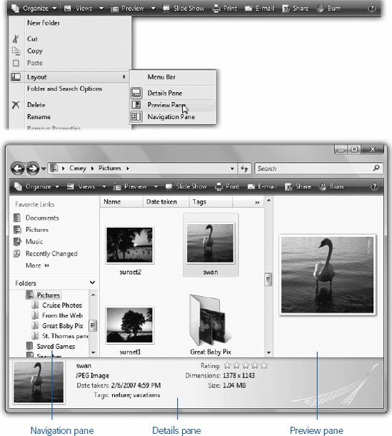 3.3. Optional Window PanesMost Explorer windows have some basic informational stuff across the top: the Address bar and the task toolbar, at the very least. But that's just the beginning. As shown in Figure 3-4, the Organize menu on the task toolbar lets you hide or show as many as four other strips of information. Turning them all on at once may make your windows feel a bit claustrophobic, but at least you'll know absolutely everything there is to know about your files and folders.