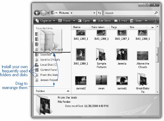 3.3.4. Navigation PaneThe Navigation pane has two halves : Favorite Links (the top part) and Folders (the bottom part). 3.3.4.1. Favorite Links listThis area lists places to which you want quick access. For example, click the Pictures icon to view the contents of your Pictures folder in the main part of the window (Figure 3-6).