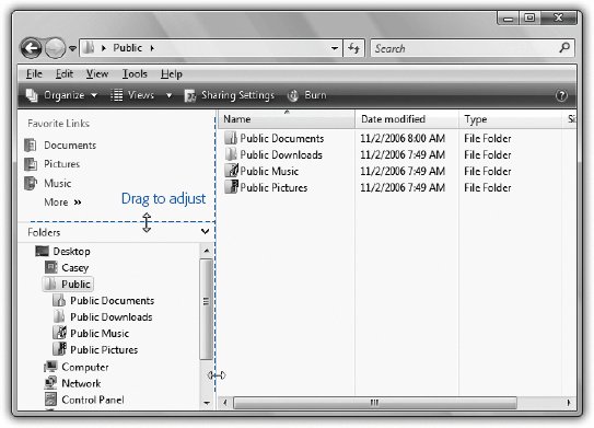 This hierarchical displays only disks and folders; the main window displays the contents (folders and files) of whatever disk or folder you click. When you double-click a folder or disk name (or single-click the flippy triangle next to it), you turn the list view into an outline; the contents of the folder appear in an indented list, as shown in Figure 3-7. Double-click again, or click the flippy triangle again, to collapse the folder listing. By selectively expanding folders like this, you can, in effect, peer inside two or more folders simultaneously , all within the single Folders list. You can move files around by dragging them onto the tiny folder icons, too. If you expand folders within folders to a sufficient level, the indentation may push the folder names so far to the right that you can't read them. You can remedy this problem either by making the pane wider (Figure 3-8), or by pointing to a folder whose name is being chopped off. Vista temporarily displays its entire name.