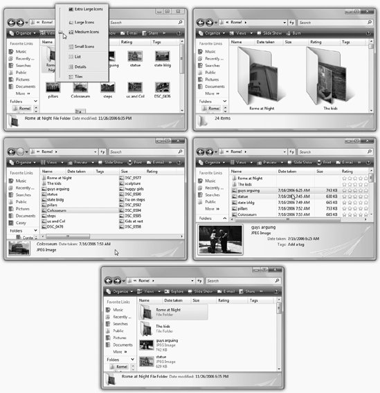 3.4. Icon and List Views Windows' windows look just fine straight from the factory; the edges are straight, and the text is perfectly legible. Still, if you're going to stare at this computer screen for half of your waking hours, you may as well investigate some of the ways these windows can be enhanced for better looks and greater efficiency. For starters, you can view the files and folders in an Explorer window in either of two ways: as icons (of any size ) or as a list. Figure 3-9 shows some of your options. | Figure 3-9. The Views pop-up menu is a little weird; it actually has two columns . At right, it displays the preset view options for the files and folders in a window. At left, a slider adjusts icon sizes to any incremental degree of scalingat least until it reaches the bottom part of its track. In any case, here's a survey of the window views in Vista. From top left: Icon view (small), Icon view (large), List view, Details view, and Tiles view. List and Details views are great for windows with lots of files. | | Every window remembers its view settings independently. You might prefer to look over your Documents folder in list view (because it's crammed with files and folders), but you may prefer to view the Pictures folder in icon view, where the icons depict miniatures of the actual photos. To switch a window from one view to another, you have three options, all of which involve the Views pop-up menu shown in Figure 3-9: -