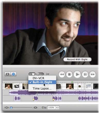 4.6. USB Camcorders These days, not all camcorders store their video on tape. There's a new breed of super-tiny, pants-pocketable microcorders that are capable of recording high-quality video directly onto memory cards. Panasonic, Fisher, Sanyo, and other companies sell such gadgets. iMovie lets you work with many of these "camcorders," or at least the ones that record in so-called MPEG-4 Simple Profile format. (You can find out by consulting the box, the Web page, or the manual.) Figure 4-8. What happens if you have both a camcorder and an iSight camera? When you move the Camera/Edit switch into the Camera position, you see a tiny down-pointing triangle next to it. From this pop-up menu, choose which camera you want to use. At this point, the Monitor window shows whatever iMovie is "seeing." If you've selected iSight or Built-in iSight, the button that's normally labeled Import now says Record With iSight. Click it to begin (and, later, to stop) recording. After a pause for processing, the video arrives in the Clips pane just like any other footage. That's not to say that iMovie actually imports MPEG-4 video the same way it imports MiniDV footage; it doesn't. But when you connect one of these 'corders to your Mac's USB jack, the memory card shows up on your screen as though it's a disk. Double-click it to reveal its contents, which include a folder with all your video recordings in it. You can bring them into iMovie by simply dragging their Finder icons into the Movie Track or Clips pane of the open iMovie window. |