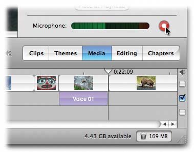 Click the round, red Record Voice button and begin to speak . You can watch the video play as you narrate. If the level meter bars are dancing , but not farther than halfway across the graph (see Figure 8-3), then your narration isn't loud enough. On playback, it'll probably be drowned out by the camcorder audio track. To increase the volume, open System Preferences, click Sound, and click the Input tab to make sure that your input volume slider is at maximum. If that's not the problem, your only options are to lean closer to the microphone, speak louder, or use an external microphone. (You can learn tricks for boosting the volume of audio tracks later in this chapter, but it's much better to get the level right the first time.) -