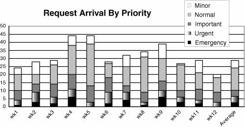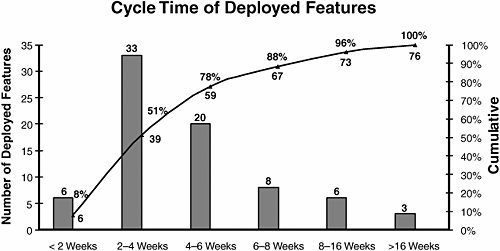 1. Define the ProblemIt's nice for a team to say "we want to be more responsive to customers," but how, exactly, does a team go about doing this? Let's follow a team through the problem-solving process. This team's biggest problem was a long list of complaints from customers who said their requests were being ignored, so the team decided to take a closer look at the problem. 2. Analyze the SituationFirst the team looked at the features that had been deployed in the last four releases and plotted the feature cycle time on a Pareto chart. The data (Figure 7.3) looked fairly goodmore than three-quarters of the features were deployed within six weeks of receiving the request. Figure 7.3. Pareto chart: cycle time of deployed features However, the team members knew that there were a lot of items in their request queue that they were ignoring, especially since new features kept on being added all the time. So they plotted a Pareto chart of the age of the features that were currently in the queue (Figure 7.4). Figure 7.4. Pareto chart: age of active customer requests The data showed that more than 60 percent of the requests in the queue were more than eight weeks old. Yet in the previous graph they saw that only nine requests they actually delivered were more than eight weeks old. They seemed to be working only on the most recent requests, not the older ones. The data also showed that the team had closed a total of 76 requests in the last four releases, or an average of 19 per release. The releases were two weeks apart, so their current rate was about ten requests a week. Since there were 568 requests in the queue, at the rate they were going it would take them more than a year (5560 weeks) to work off the current queue, even without new requests. The team next plotted the request input rate by priority category (Figure 7.5). Figure 7.5. Request arrival rate 3. Create a HypothesisA critical part of the scientific method, and one which is often overlooked by teams racing to solve problems, is to form a hypothesis that can be tested. The team members noted that the average input rate of the three highest priority request categories (emergency, urgent, and important) was ten per week, which was approximately the same as their current output rate. So their hypothesis was that if they could reduce the queue to 4050 requests, stop accepting "normal" and "minor" requests, and increase their request completion rate slightly, they could complete new requests in four weeks 90 percent of the time. 4. Perform ExperimentsThe team members decided to see if they could reduce the backlog by sending an e-mail to everyone who had requests older than eight weeks. The e-mail said they were trying to reevaluate the request backlog and would like confirmation that the person would like their request to stay in the queue. If they didn't get confirmation in a week, they would assume that the request could be canceled. Table 7.1 shows the response to the e-mail: