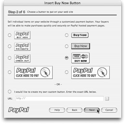 | Name: PayPal eCommerce Extension Developer: Transmit Media Source: www.transmitmedia.com/golive/paypal/ Cost: Free The PayPal eCommerce Extension allows you to add basic ecommerce to your Web sites by creating payment buttons and basic shopping-cart functionality. Visitors to your site can use credit cards to pay for items, allowing you to accept credit-card payments for items or services that you sell on your site. To receive payments, you will need to open up a free PayPal business account (unless you already have one). Customers making payments to you need not have a PayPal account, only a valid credit card. Payments made to you will be credited to your PayPal business account. PayPal even supports payments in several currencies, including US$, CA$, Euro, British pound, and Japanese yen. The extension consists of four new objects that are added to the Objects palette. When you drag any of the objects onto a page, a helpful wizard pops up (Figure 239), asks you a few questions, and writes all the necessary PayPal code for you. Figure 239. Add one of the four PayPal objects to a page, and the wizard gathers all the required information.