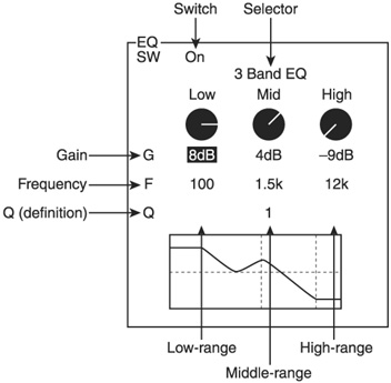 Low: This adjusts the gain ( “12db to +12db) and the shelving frequency (40 Hz - 1.5 kHz) of the low-band EQ. Mid: This adjusts the gain ( “12db to +12db), the center frequency (200 Hz - 8 kHz), and the Q (0.5 - 16) of the mid-band EQ. The mid-band EQ is not available when the two-band EQ is selected. High: This adjusts the gain ( “12db to +12db) and the shelving frequency (500 Hz - 18 kHz) of the high-band EQ. |