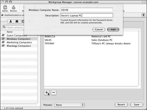 Figure 13.23. The Windows Computers List frame in Workgroup Manager lets you manage a list of Windows computers. | 5. | To manually add a Windows computer, click the Add button .