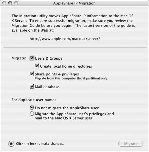 Figure 2.80. Click the lock icon to authenticate and the Migrate button to start the migration process.  | 11. | You may have to temporarily disable certain services, such as the AFP service, to continue (Figure 2.81).