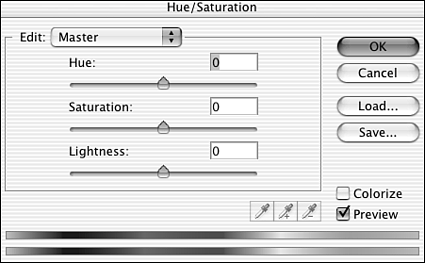 If Color Balance doesn't seem to do what you want, undo it. Adjusting with the Hue/Saturation Dialog BoxThe Hue/Saturation dialog box is a very powerful tool with a slightly misleading name . Sure, it lets you adjust the hue (colors in the image) and the saturation (the intensity of the colors), but it also gives you control over the lightness. First, look at the controls in the Hue/Saturation dialog box (see Figure 6.10). The first pop-up Edit menu lets you select either a single color to adjust or the Master setting, which adjusts all the colors in the image or selection at once. For now, work with the Master setting. Check Preview so that you can see the effects of your changes in the picture you're working on. Figure 6.10. Small adjustments to Lightness and Saturation are usually all that's needed. There are three sliders: Hue, Saturation, and Lightness. The Hue slider moves around the color wheel. With Master selected, you can move all the way from red (in the middle of the slider), leftthrough purple to blue or blue-greenor right through orange to yellow and to green. The Saturation slider takes you from 0%, in the center, to 100% saturated (pure color, with no gray) on the right, or 100% unsaturated (no color) on the left. The Lightness slider lets you increase or decrease the brightness of the image, from zero in the center, to +100 on the right, or 100 on the left. As you move these sliders, watch the two spectrum strips at the bottom of the window, as well as the image itself. The upper strip represents the current status of the image, and the lower one changes according to the slider(s) you move. If you move the Hue slider to +60, for example, you can see that the reds in the picture turn quite yellow and the blues turn purple. In effect, what you are doing is skewing the color spectrum by that amount. If you move the Saturation slider to the left, you'll see the lower spectrum strip become less saturated. If you move the Lightness slider, you'll see its effects reflected in the lower spectrum strip as well.