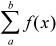 <mstyle displaystyle="true"> <munderover> <mo>∑</mo> <mi>a</mi> <mi>b</mi> </munderover> <mrow> <mi>f</mi> <mi>⁡</mi> <mrow> <mi>(</mi> <mo>x</mo> <mo>)</mo> </mrow> </mrow> </mstyle>