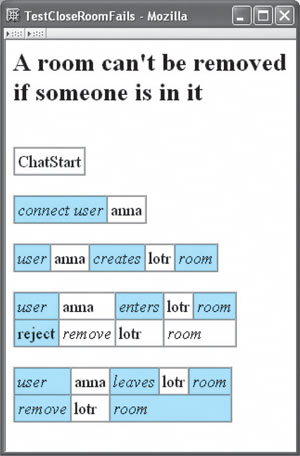 28.4. Expected Errors with DoFixtureConsider now the test from Section 10.2 on p. 74, shown again in Figure 28.4. The second row of the fourth table tests that the action to remove a room is rejected. Figure 28.4. TestCloseRoomFails The reject special action calls the method removeRoom() in the system under test. The method removeRoom() returns false in this case, as it's not possible to remove a room if users are in it. Hence, the reject succeeds. |