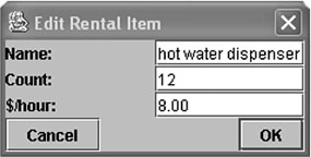 32.2. SpikeAfter some discussion about the best place to start, Emily decided to start with a simple mockup rather than with the full RentEz system. She developed the simple Fit test shown in Figure 32.1. This test includes a setup table to define two rental items, followed by a table to check the current set of rental items. Figure 32.1. Setup and Check Emily then developed a much simplified user interface for part of RentEz to run this test. This UI is shown in Figure 32.2; when the user clicks the Add button, the dialog box shown in Figure 32.3 results. Figure 32.2. Spiked RentEz Application Figure 32.3. Dialog Box for Adding Rental Items Note In Extreme Programming, a spike is a short experiment with some technology or some possible solution to a problem. The idea is to learn from the experience and to then apply the improved understanding to the system under development. |