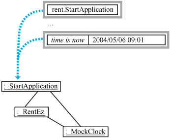 34.3. Time-Related Object InteractionsFigure 34.2 shows the interaction of the fixtures with the system under test and the MockClock. When the StartApplication object is created, it creates an object of class RentEz, passing to it a MockClock. The system under test subsequently uses that clock for the time, which is updated by time is now actions. Figure 34.2. Using a Mock Clock |