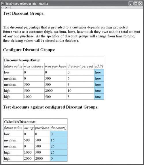 7.1. Using Spreadsheets for TestsFit tests can be easily created by using a spreadsheet. It can be convenient to use the spreadsheet to calculate some values, such as the calculated column values of a ColumnFixture table, instead of working them out by hand. To distinguish the Fit tables from other text within a spreadsheet, test tables have borders, as shown by the Excel spreadsheet TestDiscountGroups.xls in Figure 7.1. Figure 7.1. Creating a Spreadsheet File with Excel Once you've edited a spreadsheet and saved it, you can run Fit on it to get a report. If you're not a programmer, ask a programmer to set things up for you (as discussed in Chapter 26). The report in the TestDiscountGroups.html file results from running Fit on the spreadsheet in Figure 7.1. Double-click on this file to view it through a browser. For example, the report resulting from the test in the spreadsheet in Figure 7.1 is shown in Figure 7.2. Figure 7.2. Report from the Spreadsheet File in Figure 7.1 After changing and saving the spreadsheet, you will need to run the tests again. Then click the Refresh button on your browser to see the latest report. Questions & Answers