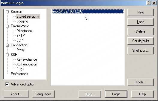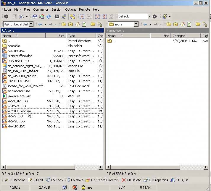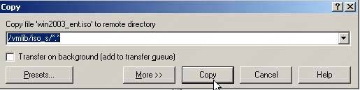 8.3. WinSCPWinSCP is a free open source tool that allows Windows machines SSH access to Linux/Unix systems. The interface for this tool is very intuitive and familiar looking if you use Norton Commander or Windows Explorer. We use this tool for transferring ISO images and other files such as .flp (floppy images) onto our ESX Server. To get WinSCP, go to winscp.net/eng/download.php. To use WinSCP, load it on your client system and start it. Input the required data to log in to your ESX Server, and then click Login (see Figure 8.6). Figure 8-6. Starting a WinSCP Session Save the login information as a Stored Session so you don't have to type it in every time. The next time you log in to your ESX Server, you'll be prompted to select a stored session or create a new connection (see Figure 8.7). Figure 8-7. Selecting a Stored Session Once you're logged in to your ESX Server, it should look something like the image in Figure 8.8 Figure 8-8. Logging In to the ESX Server You can select a file in the left pane, which is your client system. Change the default directory on your client system to wherever your file is. In this example, we'll be moving an ISO image onto the ESX Server, which is in an ISO_s directory on the root of C:. We'll move it to the /vmlib/iso_s directory on the ESX Server. Once you have your source file and target directory defined, you can press the F5 function key. You'll be prompted to copy the file to the path shown, or you can change the path (see Figure 8.9). Figure 8-9. WinSCP Copy If you click the More button, you can select different options to apply to the file, including permissions placed on the file. Once you've selected any of the options you want, click Copy, and WinSCP begins copying the file over to your ESX Server (see Figure 8.10). Figure 8-10. Selecting More Copy Options Since the file we're copying over in this example is an ISO image, once it's copied to your ESX Server, it can be used by your virtual machines as described in the previous section. |