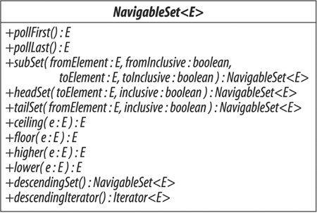 The following code shows SortedSet working with a set of PriorityTasks (in fact, we have declared a NavigableSet so that we can use the same set in later examples. But for the moment, we will just use the methods of SortedSet): NavigableSet<PriorityTask> priorityTasks = new TreeSet<PriorityTask>(); priorityTasks.add(new PriorityTask(mikePhone, Priority.MEDIUM)); priorityTasks.add(new PriorityTask(paulPhone, Priority.HIGH)); priorityTasks.add(new PriorityTask(databaseCode, Priority.MEDIUM)); priorityTasks.add(new PriorityTask(interfaceCode, Priority.LOW)); assert(priorityTasks.toString()).equals( "[phone Paul: HIGH, code db: MEDIUM, phone Mike: MEDIUM, code gui: LOW]"); Could you not simply compare the priorities of the tasks, without using the string representation as a secondary key? A partial ordering like that would be useful if you want to preserve some aspects of the original ordering; for example, you might wish to sort tasks by priority but, within each priority, preserve the order in which they were added to the set. But the contract for SortedSet (and, as we shall see later, SortedMap) states that it will use the compare method of its Comparatoror, if it does not have one, the compareTo method of its elementsinstead of the elements' equals method to determine when elements are distinct. This means that if a number of elements compare as the same, the set will treat them as duplicates, and all but one will be discarded. The methods defined by the SortedSet interface fall into three groups: Getting the First and Last Elements E first() // return the first element in the set E last() // return the last element in the set If the set is empty, these operations throw NoSuchElementException. Retrieving the Comparator Comparator<? super E> comparator() This method returns the set's comparator if it has been given one at construction time. The type Comparator<? super E> is used because a SortedSet parameterized on E can rely for ordering on a Comparator defined on any supertype of E. For example, recalling Section 3.3, a Comparator<Fruit> could be used with a SortedSet<Apple>. Getting Range Views SortedSet<E> subSet(E fromElement, E toElement) SortedSet<E> headSet(E toElement) SortedSet<E> tailSet(E fromElement) The method subSet returns a set containing every element of the original set that is greater than or equal to fromElement and less than toElement. Similarly, the method headSet returns every element that is less than toElement, and tailSet returns every element that is greater than or equal to fromElement. Note that the arguments to these operations do not themselves have to be members of the set. The sets returned are half-open intervals: they are inclusive of the fromElementprovided it actually is a set member, of courseand exclusive of the toElement. In our example, these methods could be useful in providing different views of the elements in priorityTasks. For instance, we can use headSet to obtain a view of the high- and medium-priority tasks. To do this, we need a special task that comes before all others in the task ordering; fortunately, we defined a class EmptyTask for just this purpose in Section 12.1. Using this, it is easy to extract all tasks that come before any low-priority task: PriorityTask firstLowPriorityTask = new PriorityTask(new EmptyTask(), Priority.LOW); SortedSet<PriorityTask> highAndMediumPriorityTasks = priorityTasks.headSet(firstLowPriorityTask); assert highAndMediumPriorityTasks.toString().equals( "[phone Paul: HIGH, code db: MEDIUM, phone Mike: MEDIUM]"); In fact, because we know that tasks with empty details will never normally occur, we can also use one as the first endpoint in a half-open interval: PriorityTask firstMediumPriorityTask = new PriorityTask(new EmptyTask(), Priority.MEDIUM); SortedSet<PriorityTask> mediumPriorityTasks = priorityTasks.subSet( firstMediumPriorityTask, firstLowPriorityTask); assert mediumPriorityTasks.toString().equals( "[code db: MEDIUM, phone Mike: MEDIUM]"); Not all orderings can be treated so conveniently; suppose, for example, that we want to work with the set of all the medium-priority tasks up to and including the mikePhone task. To define that set as a half-open interval, users of SortedSet would need to construct the task that immediately follows the mikePhone task in the PriorityTask ordering, and for that you would need to know that the string that succeeds "Mike" in the natural ordering is "Mike\0" (that is, "Mike" with a null character appended). Fortunately, users of NavigableSet have a much more intuitive way of defining this set, as we shall see in a moment. Notice that the sets returned by these operations are not independent sets but new views of the original SortedSet. So we can add elements to the original set and see the changes reflected in the view: PriorityTask logicCodeMedium = new PriorityTask(logicCode, Priority.MEDIUM); priorityTasks.add(logicCodeMedium); assert mediumPriorityTasks.toString().equals( "[code db: MEDIUM, code logic: MEDIUM, phone Mike: MEDIUM]"); The reverse applies also; changes in the view are reflected in the original set: mediumPriorityTasks.remove(logicCodeMedium); assert priorityTasks.toString().equals( "[phone Paul: HIGH, code db: MEDIUM, phone Mike: MEDIUM, code gui: LOW]"); To understand how this works, think of all the possible values in an ordering as lying on a line, like the number line used in arithmetic. A range is defined as a fixed segment of that line, regardless of which values are actually in the original set. So a subset, defined on a SortedSet and a range, will allow you to work with whichever elements of the SortedSet currently lie within the range. 13.2.1.13.2.1.1. NavigableSetNavigableSet (see Figure 13.5) was introduced in Java 6 to supplement deficiencies in SortedSet. As we mentioned at the beginning of this section, new client code should use it in preference to SortedSet. It adds methods in four groups. Getting the First and Last Elements E pollFirs