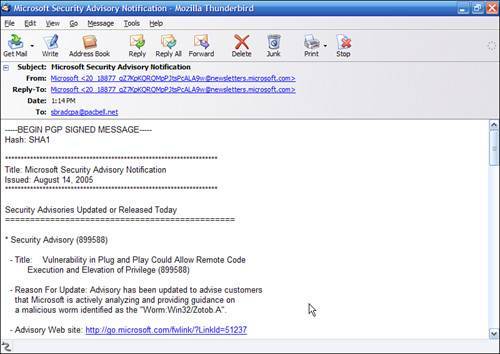 | At a minimum, you should sign up for the Microsoft Security Bulletin notifications Comprehensive edition. This gives you an email on the second Tuesday of every month listing exactly what patches have been released. In addition, it gives you a heads-up email on the Thursday before and security advisories as shown in Figure 22.3. Figure 22.3. Sample security advisory from Microsoft warning customers of the release of Worm.